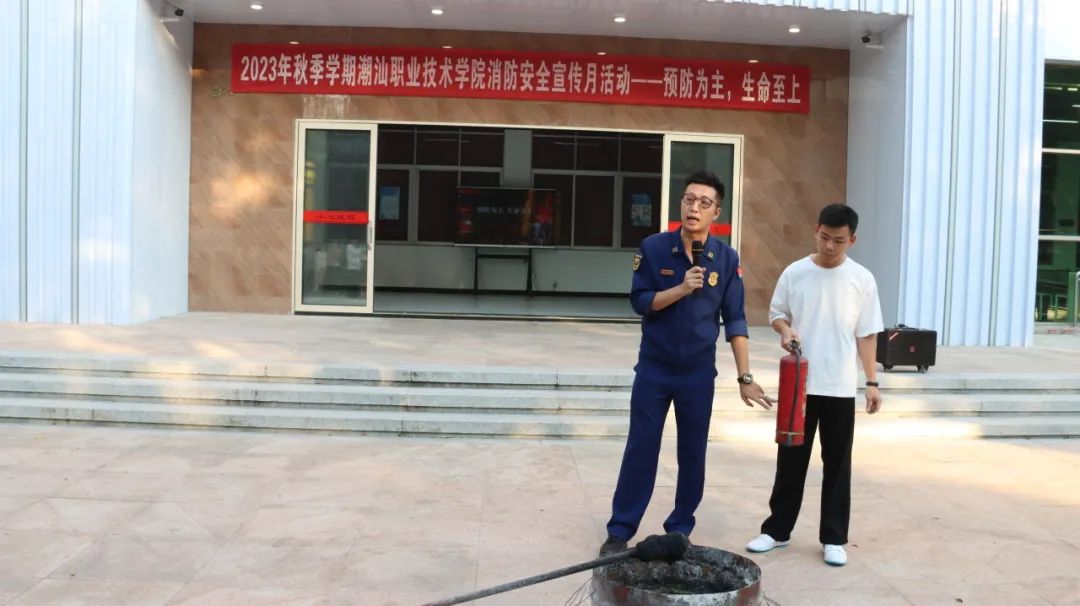 普宁市南环大道消防救援站政治指导员陈楷煜同志现场在演示如何正确使用灭火器,让在场师生切实地了解、掌握灭火器的正确操作技能,并特地提醒大家一定要注意风向及火势,实在不能扑灭要及时拨打消防救援电话119进行求助。
