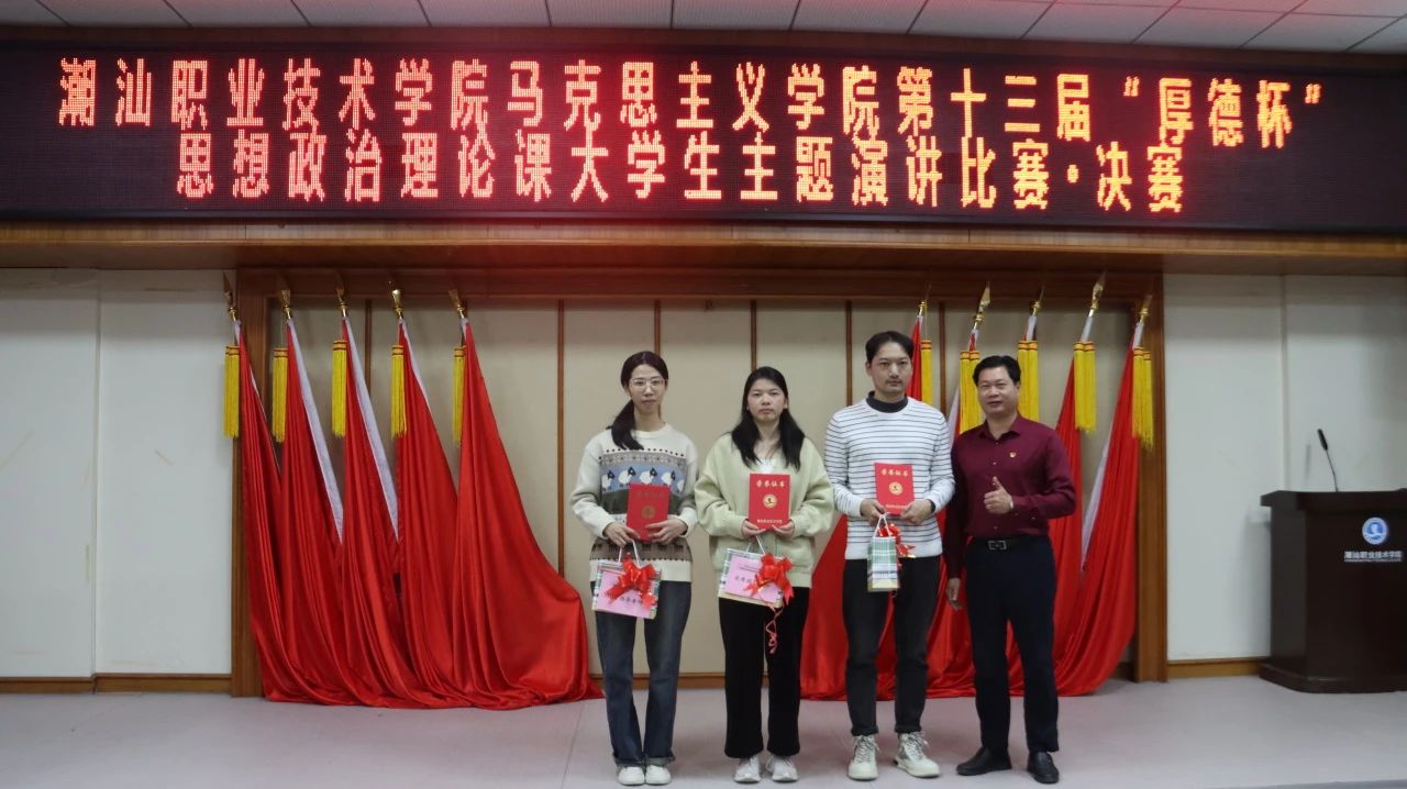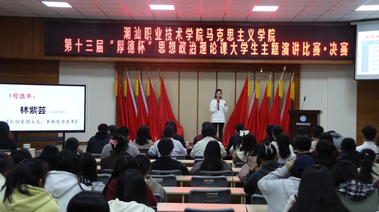 12月20日下午,作为《思想道德与法治》课程的教学实践环节,潮汕职业技术学院马克思主义学院第十三届“厚德杯”思想政治理论课大学生主题演讲比赛决赛在第二报告厅举行。