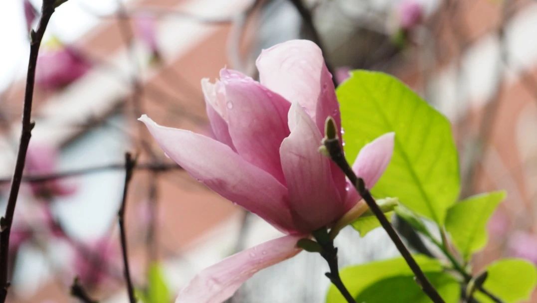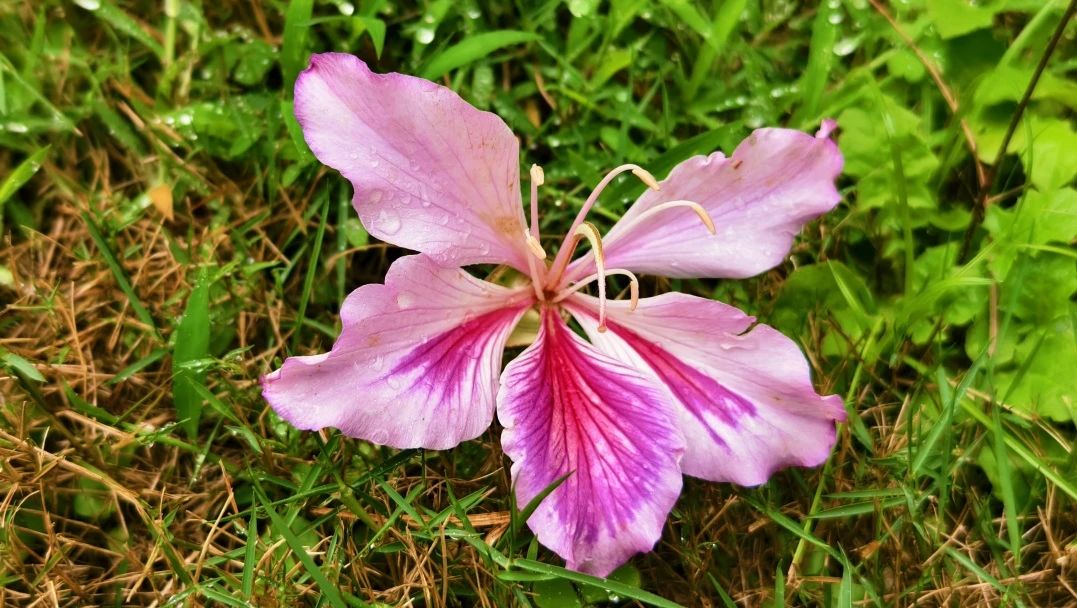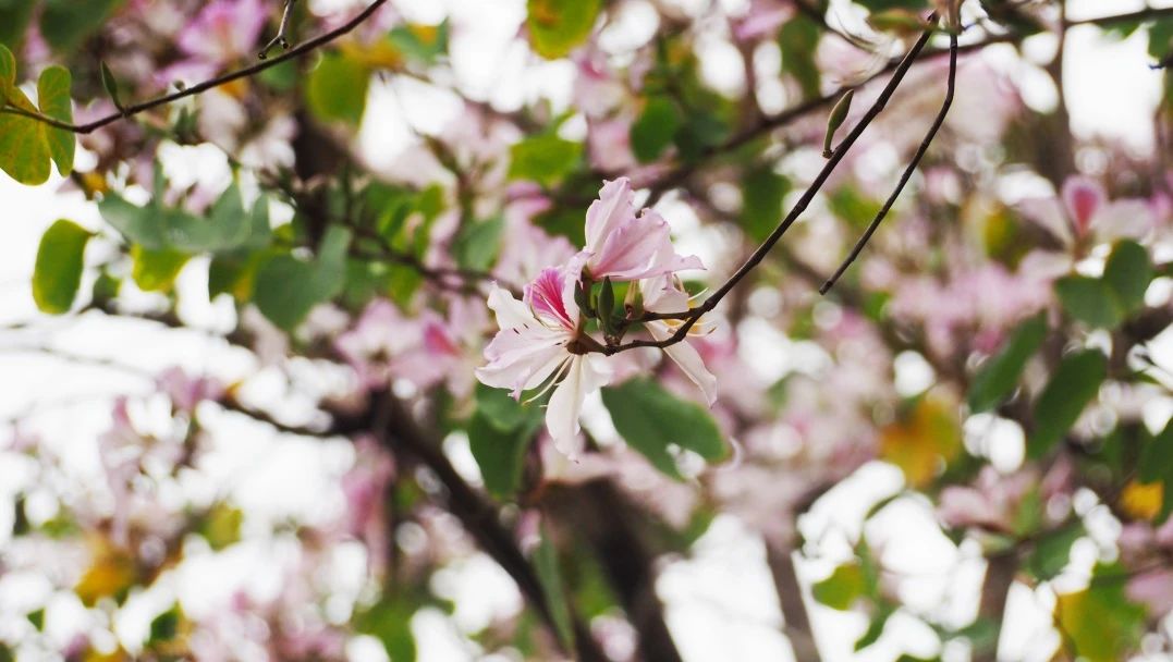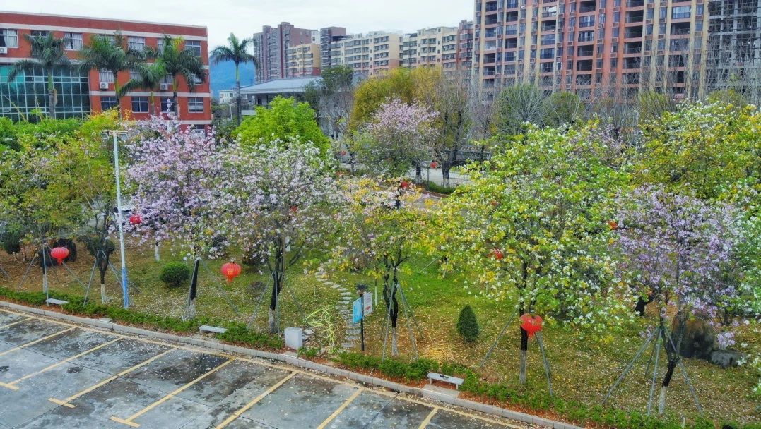 健康驿站前垂落的粉色紫荆